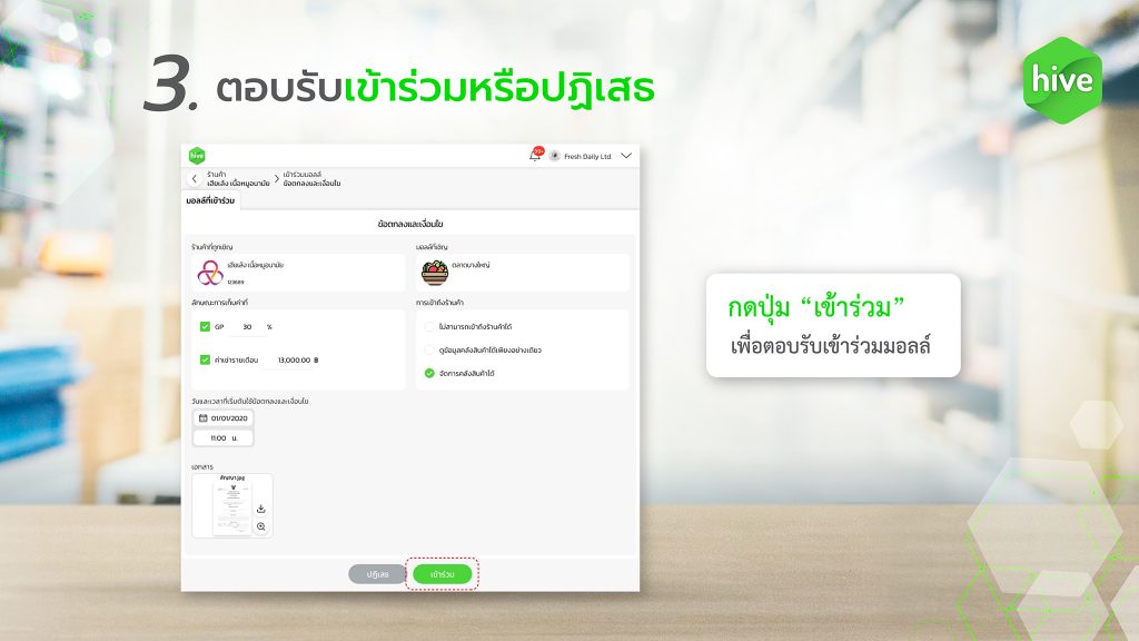 หลังจากที่ได้พิจารณาข้อตกลงทั้งหมดแล้ว ในขั้นตอนนี้ ร้านค้าสามารถเลือกตอบรับคำเชิญ เข้าร่วม หรือ ปฏิเสธ ได้ตามความต้องการ