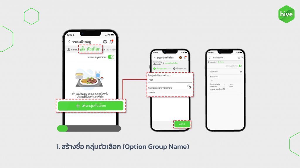 ยกตัวอย่าง : กรณีตัวเลือก ซอส ร้านค้าจะต้องเพิ่มรายละเอียดเพิ่มเติมเกี่ยวกับซอส