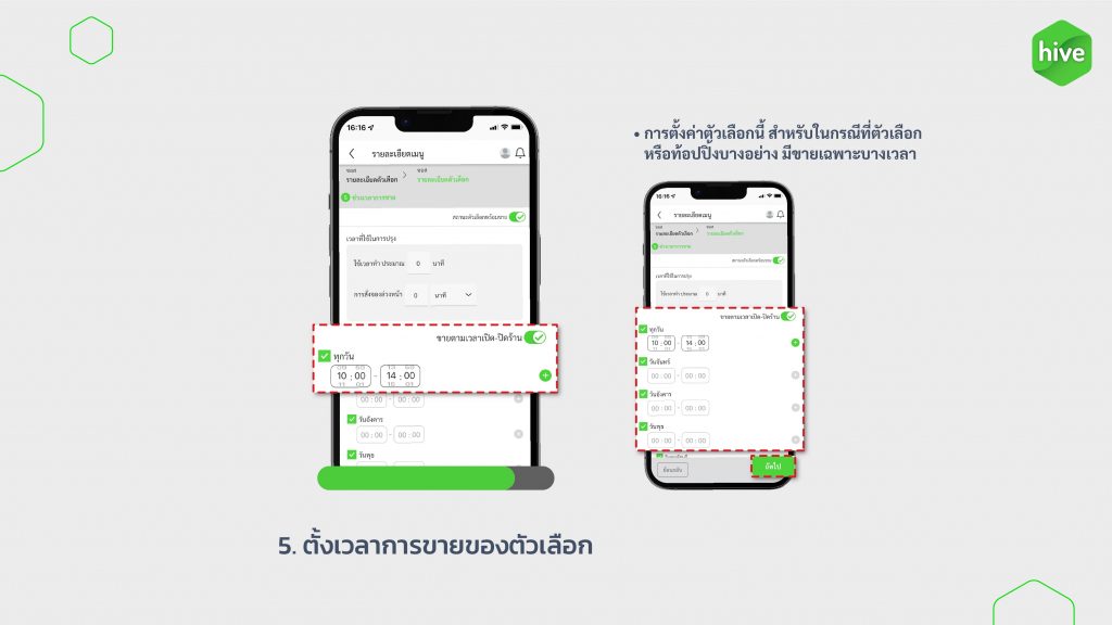 นอกจากการตั้งราคาแล้ว ร้านค้ายังสามารถตั้งค่าตัวเลือกเวลาการขายของตัวเลือกได้เช่นกัน ในกรณีที่บางวัตถุดิบ หรือท็อปปิ้งบางอย่าง มีขายเฉพาะบางเวลา