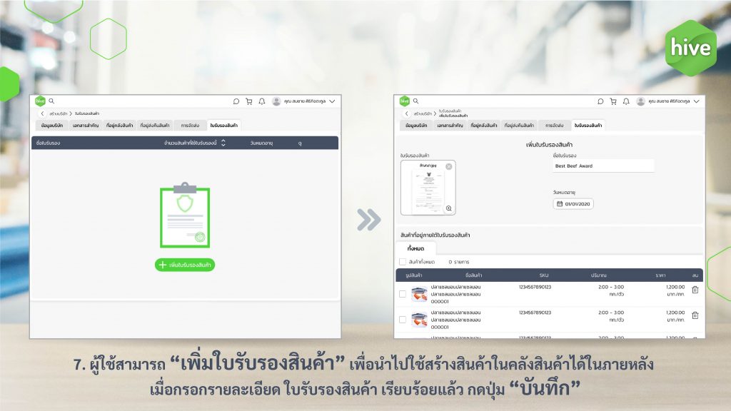 - ให้ผู้ใช้เลือกสินค้าที่อยู่ภายใต้ใบรับรองสินค้านั้นๆ โดยสามารถเพิ่มสินค้าในรายการโดยกดที่ ‘ (+) เพิ่มสินค้า’