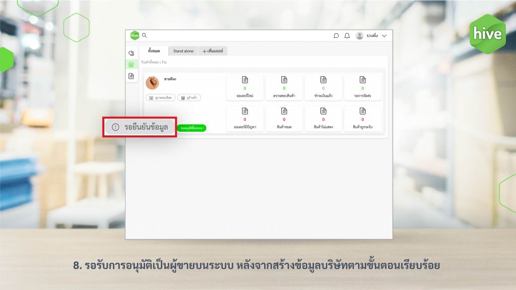 หลังจากที่ผู้ใช้ได้บันทึกข้อมูลครบถ้วนตามขั้นตอนเรียบร้อยแล้ว จะต้องรอรับการอนุมัติเป็นผู้ขายบนระบบ ระบบจะแสดงผลดังภาพในคู่มือว่า ‘รอยืนยันข้อมูล’